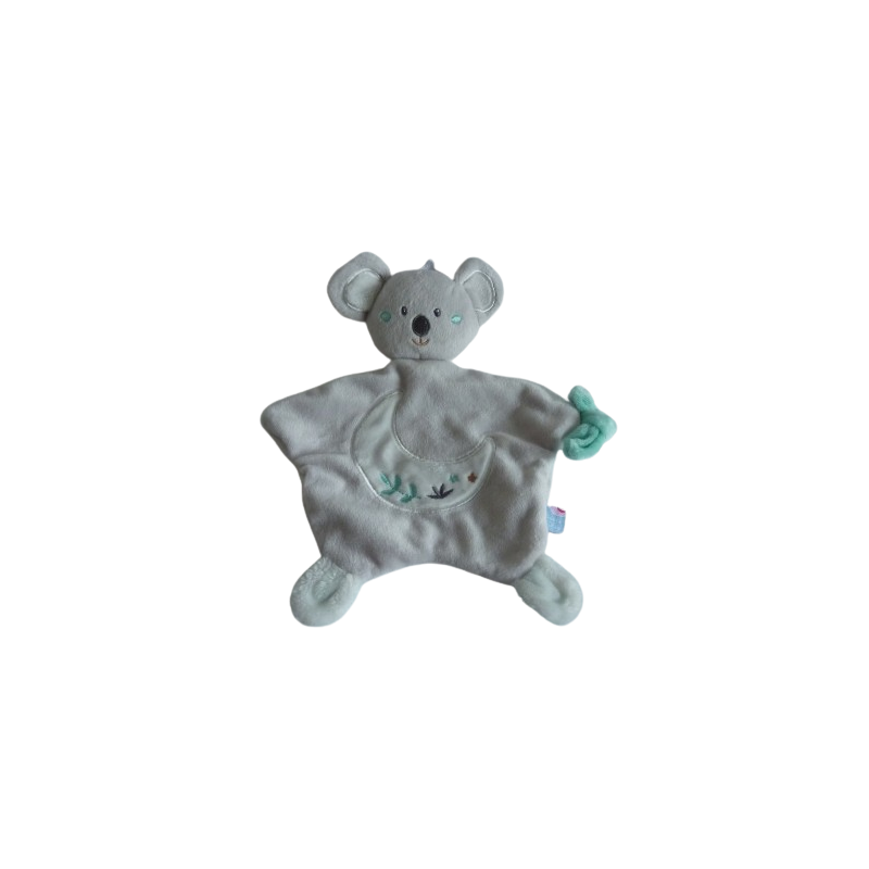 Doudou plat koala 26 cm environ, gris clair motif lune étoiles feuillage. Etat : Comme neuf