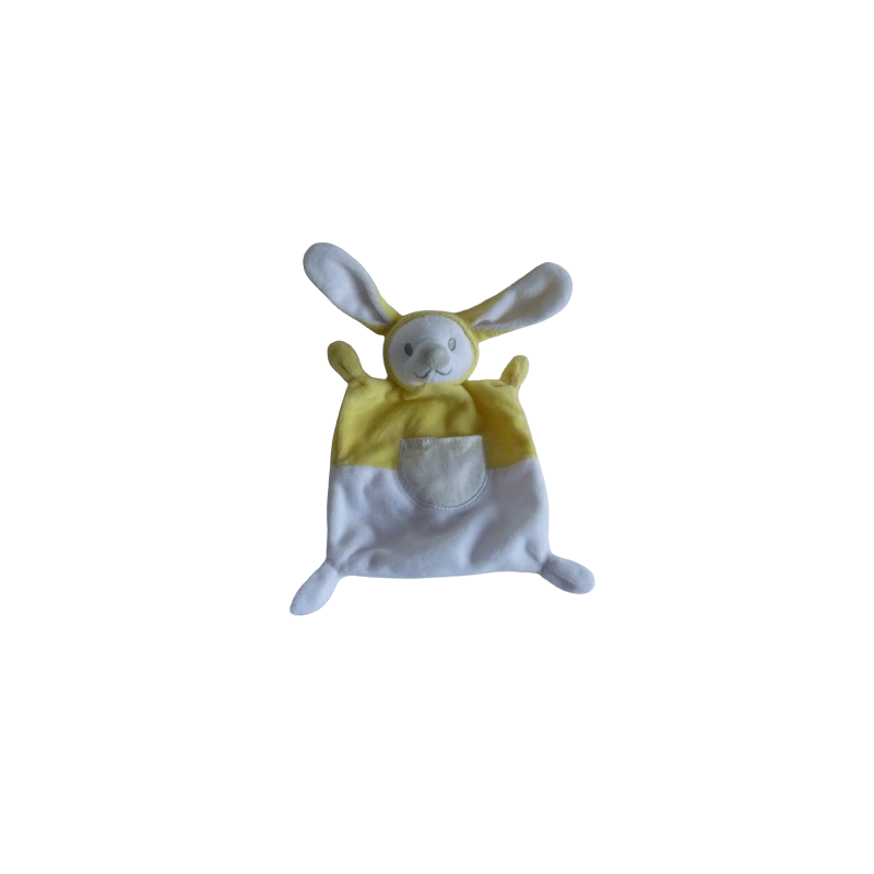 Doudou plat lapin 21 cm environ sans compter les oreilles, jaune blanc petite poche motif étoiles. Etat : Le doudou est en parfait état (il manque des étoiles sur la poche et l'étiquette de la marque est coupée)Destinataire :
