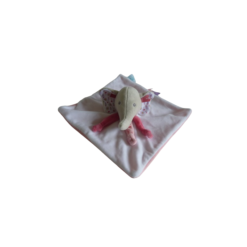 Doudou plat éléphant 24x24 cm environ, blanc rose. Etat : Comme neuf