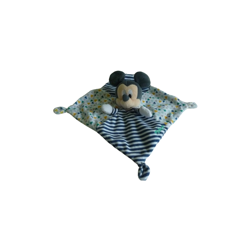Doudou plat souris Mickey 24x24 cm environ, blanc motifs rayures triangles. Etat : Parfait état