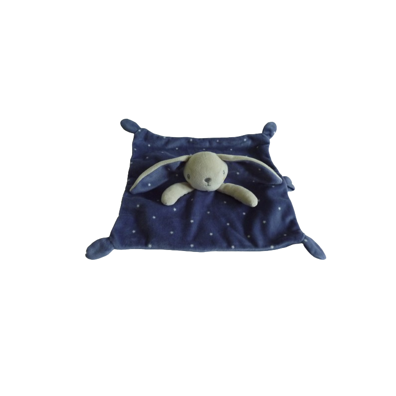 Doudou plat lapin 25x25 cm environ, attache tétine, bleu gris motif étoiles. Etat : Parfait état (étiquette marque coupée)Destinataire :