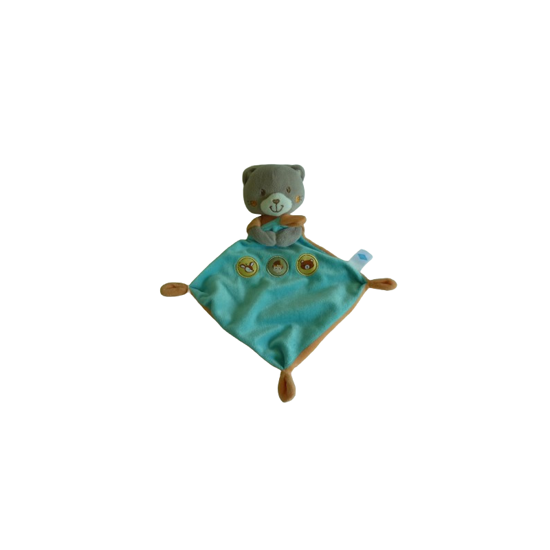 Doudou plat chat ou ours forme losange 32 cm environ, bleu turquoise orange gris. Etat : Comme neufDestinataire :