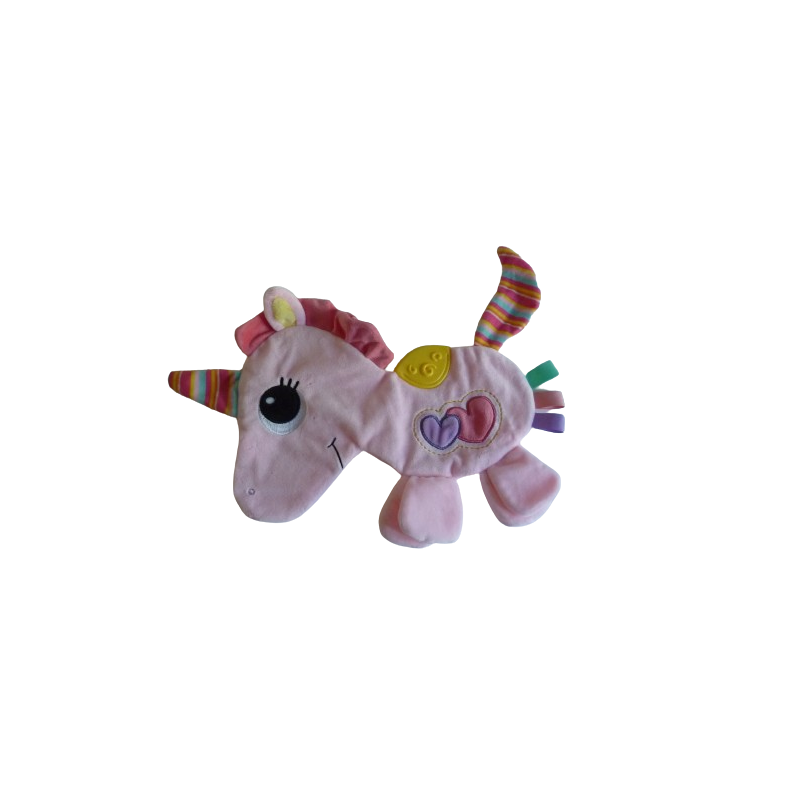 Doudou plat licorne 35 cm environ de large, bruit papier froissé, anneau dentition, rose motif coeur. Etat : Comme neuf (minis accrocs dû aux attaches étiquettes boutique)Destinataire :