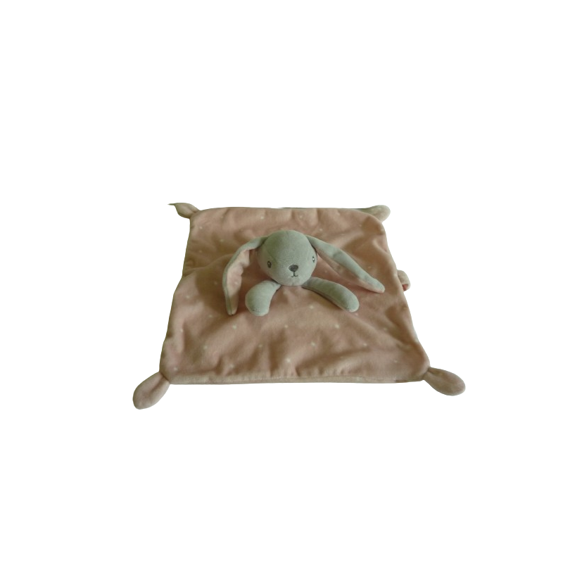 Doudou plat lapin 25x25 cm environ, attache tétine, rose gris motif étoiles. Etat : Comme neuf (étiquette marque coupée)