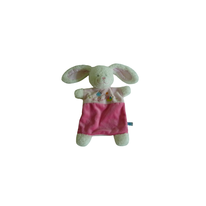 Doudou plat lapin 26 cm environ sans compter les oreilles, rose motifs oiseaux. Etat : Excellent étatDestinataire :