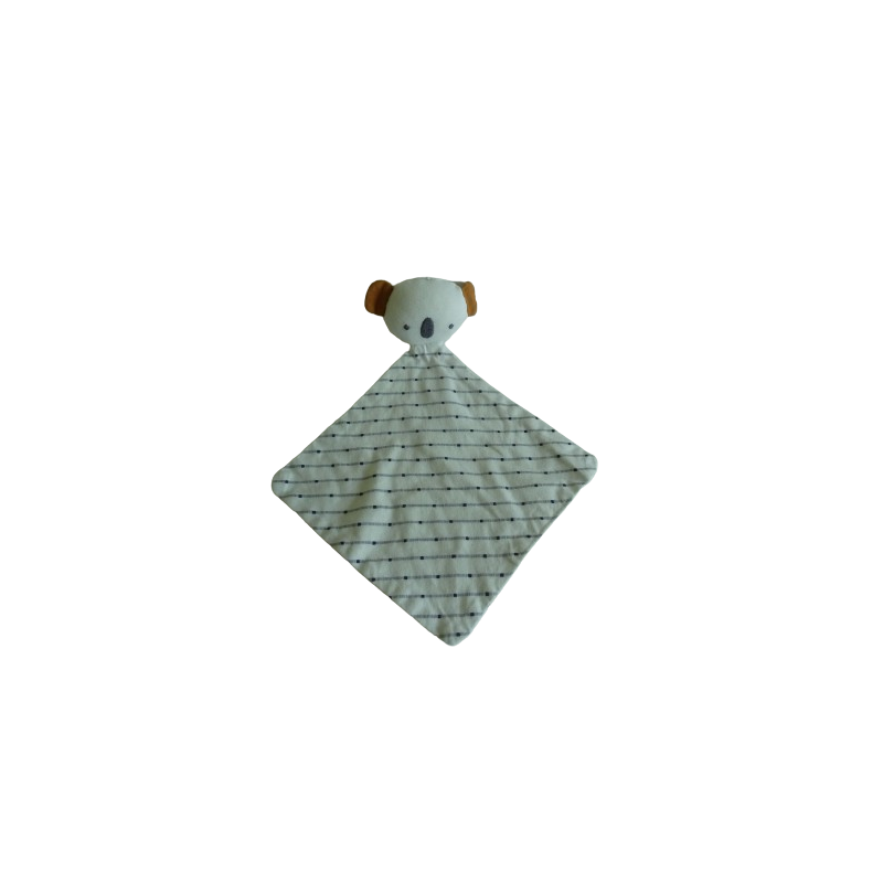 Doudou plat koala forme losange 31 cm environ, blanc à motifs. Etat : Comme neuf (étiquette marque coupée)Destinataire :