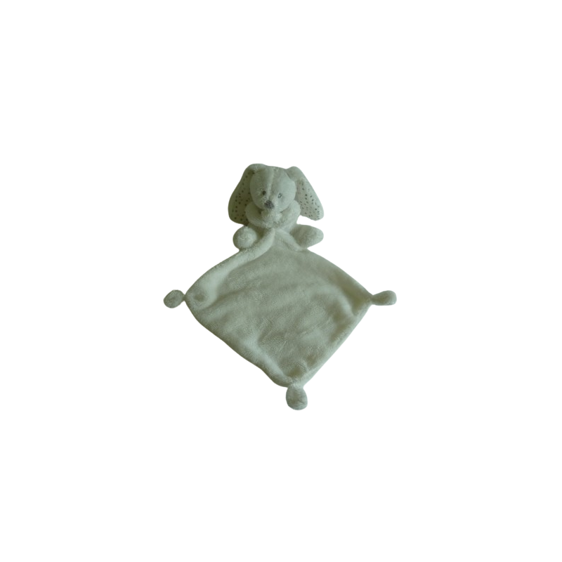 Doudou peluche lapin blanc motif étoiles 13 cm environ, mouchoir blanc 19x19 cm environ. Etat : Parfait état (étiquette d'informations coupée)