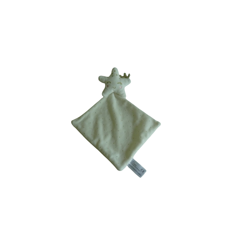 Doudou plat étoile forme losange 35 cm environ, blanc motif étoiles. Etat : Comme neuf