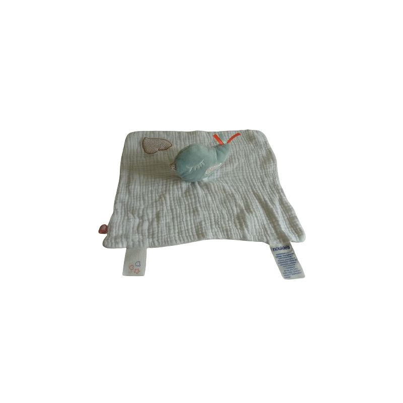 Doudou plat oiseau lange 27x27 cm environ, oiseau bleu turquoise, lange blanc motif coeur. Etat : Comme neufDestinataire :