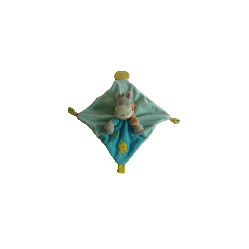 Doudou plat cheval ou zèbre 22x22 cm environ, attache tétine, anneau dentition, bleu turquoise motif oiseau. Etat : Très bon état