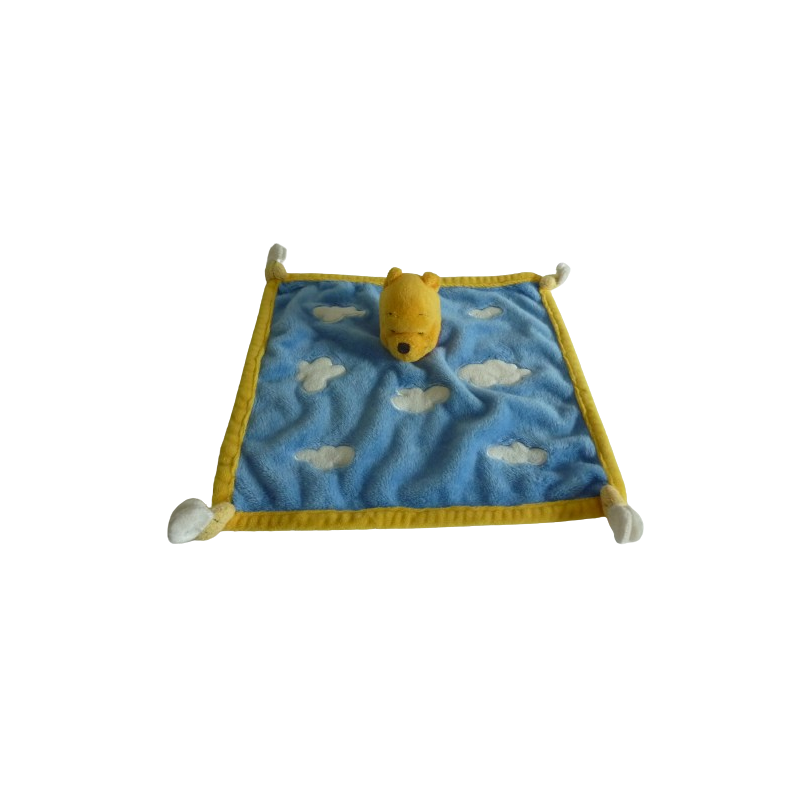 Doudou plat ours Winnie 28x28 cm environ, marron bleu motif nuages abeille aux 4 coins. Etat : Très bon étatDestinataire :