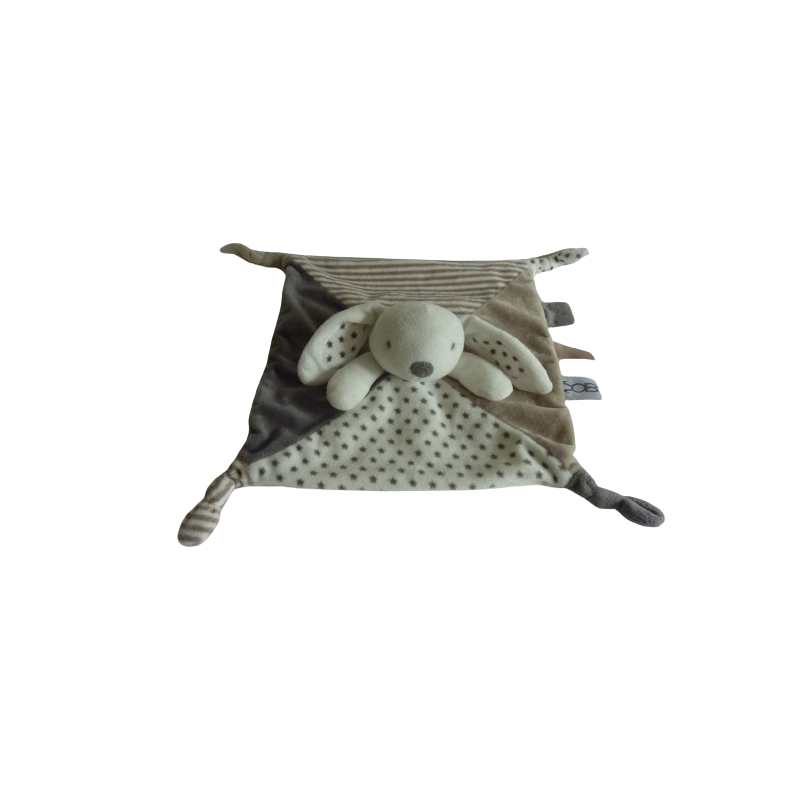 Doudou plat lapin 27x27 cm environ, blanc gris marron taupe motif étoiles. Etat : Comme neuf (étiquette marque coupée)
