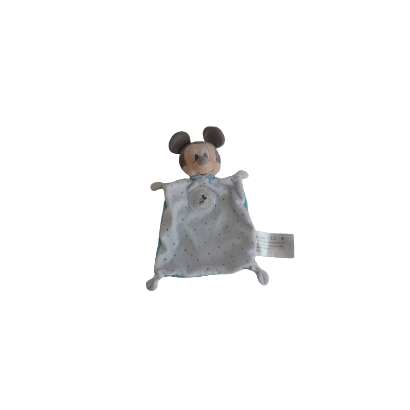 Doudou plat Mickey 28 cm environ, blanc bleu turquoise gris motif étoiles écusson Mickey. Etat : Comme neuf