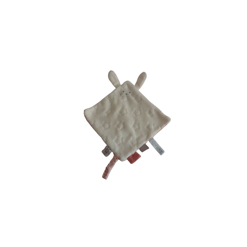 Doudou plat lapin 37 cm environ, attache tétine, matière bruissante, blanc rose motif étoiles. Etat : Comme neuf