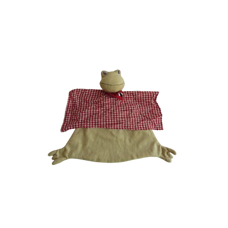 Doudou plat grenouille 36 cm environ, vert carreaux vichy rouge et blanc bandana rouge motif mouche. Etat : Comme neuf (étiquette marque coupée)