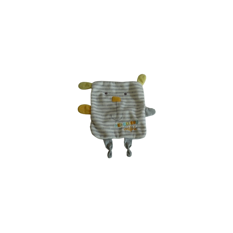 Doudou plat lapin 25 cm environ de hauteur, gris rayures jaune, Mon Doudou préféré brodé. Etat : Comme neuf (étiquette de la marque coupée)Destinataire :