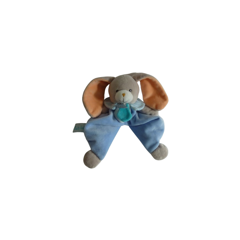 Doudou plat lapin Pom 26 cm environ sans compter les oreilles, bleu. Etat : Excellent état (juste le haut d'une oreille moins doux, rien de méchant)