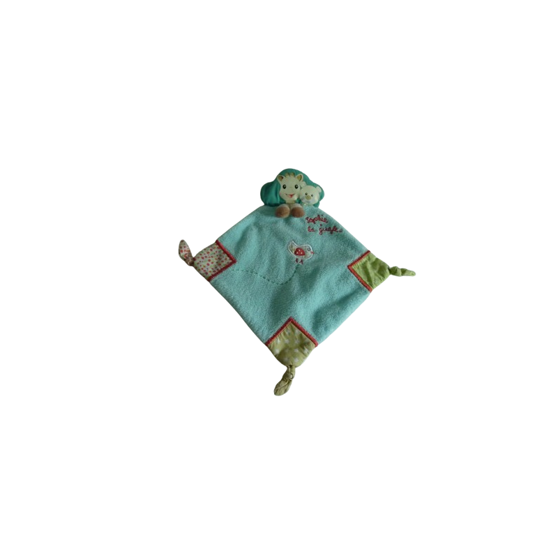 Doudou plat Sophie la Girafe forme losange 32 cm environ, 3 nouages bleu motifs. Etat : Comme neuf