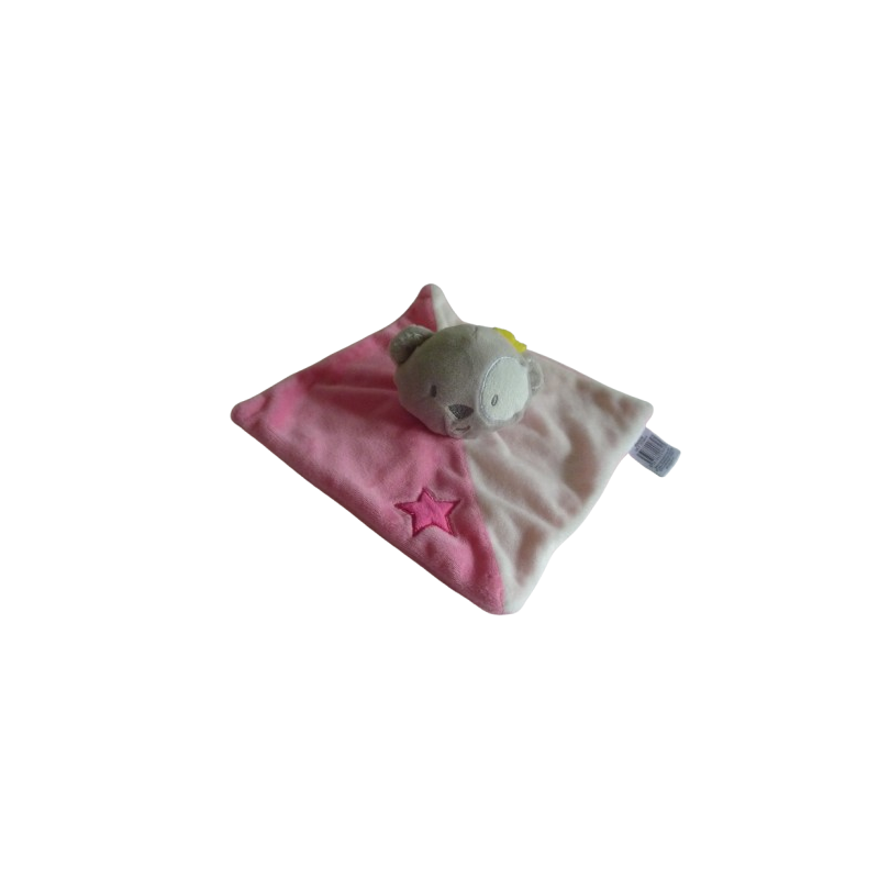 Doudou plat ours 19x19 cm environ, rose motif étoile, couronne jaune sur la tête. Etat : Comme neuf