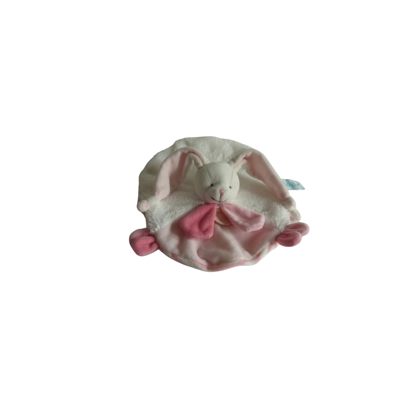 Doudou plat lapin 22 cm environ de large, rose blanc rayures blanc rose au verso. Etat : Comme neuf