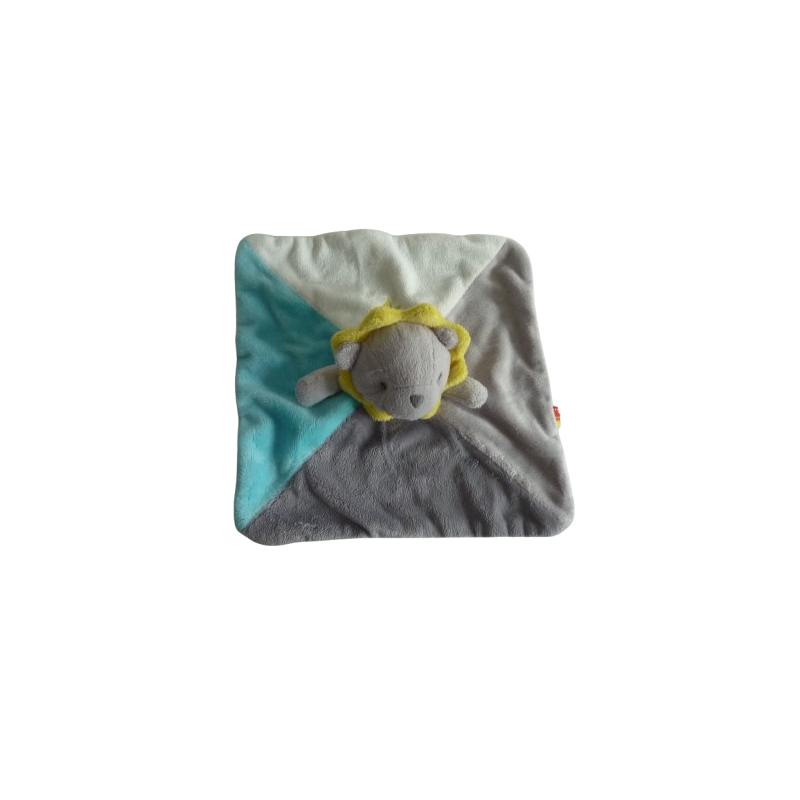 Doudou plat lion 23x23 cm environ, gris blanc turquoise jaune, rayures au verso. Etat : Comme neufDestinataire :