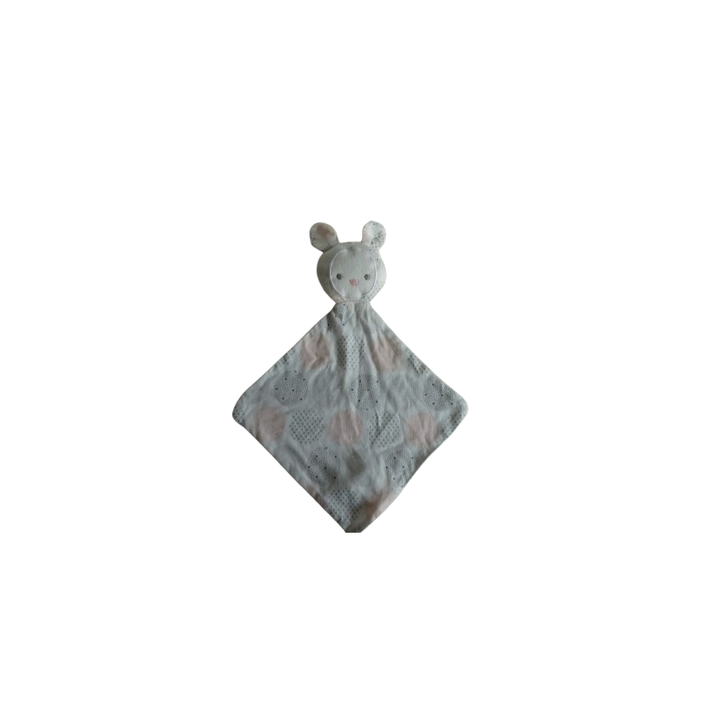 Doudou plat lapin forme losange 35 cm environ, blanc motifs ronds argenté rose. Etat : Parfaite étatDestinataire :