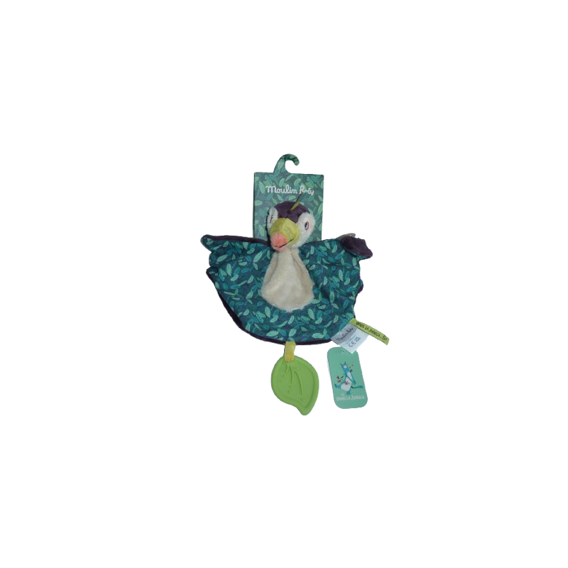 Doudou plat toucan 32 cm environ, anneau dentition, attache tétine, vert feuillage beige violet foncé. Etat : NeufDestinataire :