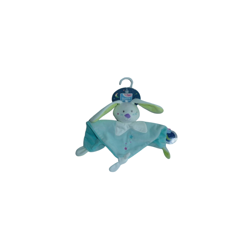Doudou plat lapin 32 cm environ de large, attache tétine, brille la nuit, blanc vert turquoise. Etat : Neuf