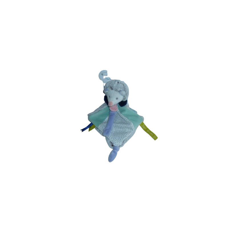 Doudou plat attache sucette hérisson forme losange 26 cm environ, gris chiné vert blanc motif pois. Etat : NeufDestinataire :
