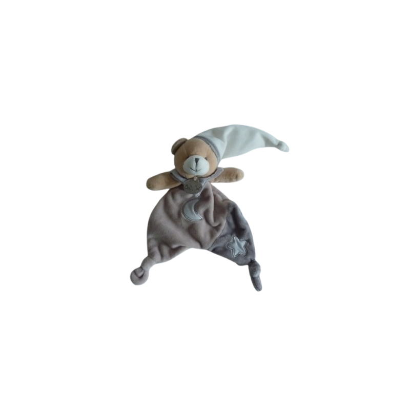 Doudou plat ours 28 cm environ, marron gris blanc motif lune étoile luminescent. Etat. : Comme neuf (étiquette marque coupée)Destinataire :