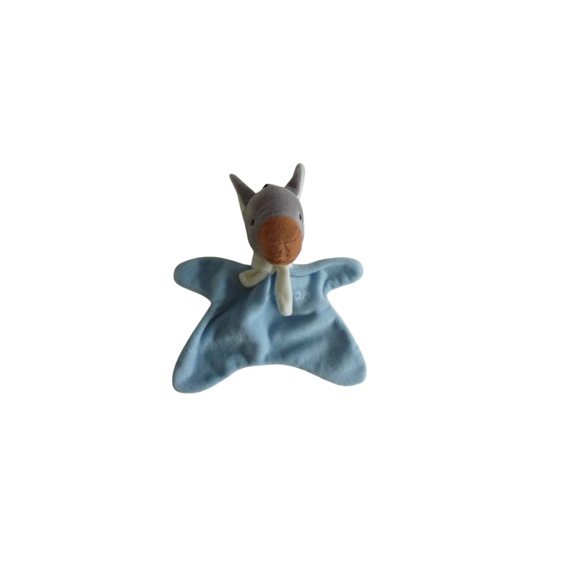 Doudou plat âne 32 cm environ, bleu gris blanc Corsica brodé. Etat : Comme neuf (étiquette marque coupée)Destinataire :
