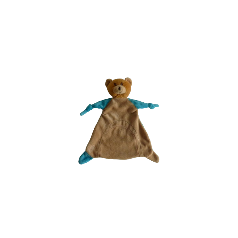 Doudou plat ours 33 cm environ, marron turquoise. Etat : Comme neuf