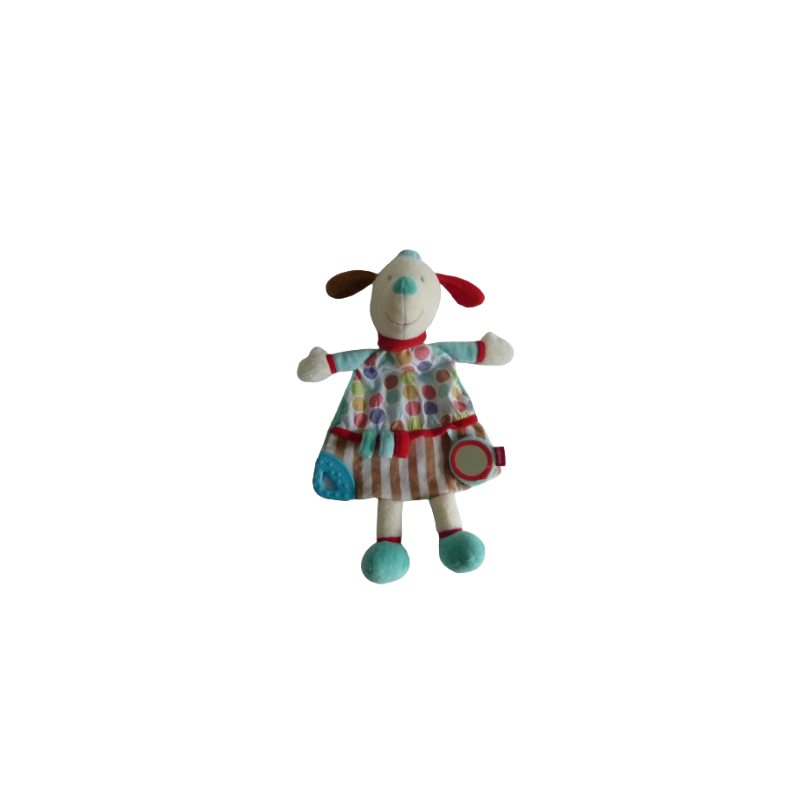 Doudou plat chien 37 cm environ, miroir grelot anneau dentition, multicolore. Etat : Bon état (anneau dentition un peu abîmé, micro taches, rien de méchant et de très visible) idéal doudou de secoursDestinataire :