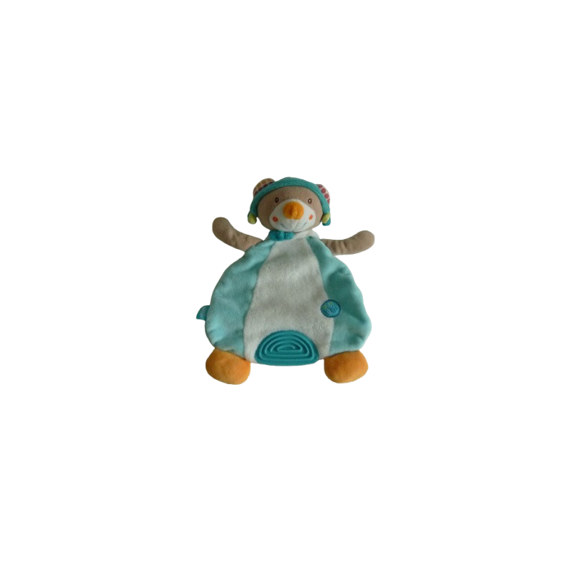 Doudou plat ours avec anneau de dentition 27 cm environ, turquoise blan orange, écusson Bon voyage. Etat : Comme neufDestinataire :