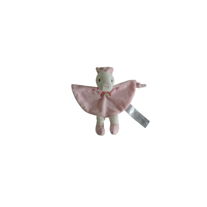 Doudou plat licorne 24 cm environ, rose blanc motif arc en ciel. Etat : Comme neufDestinataire :