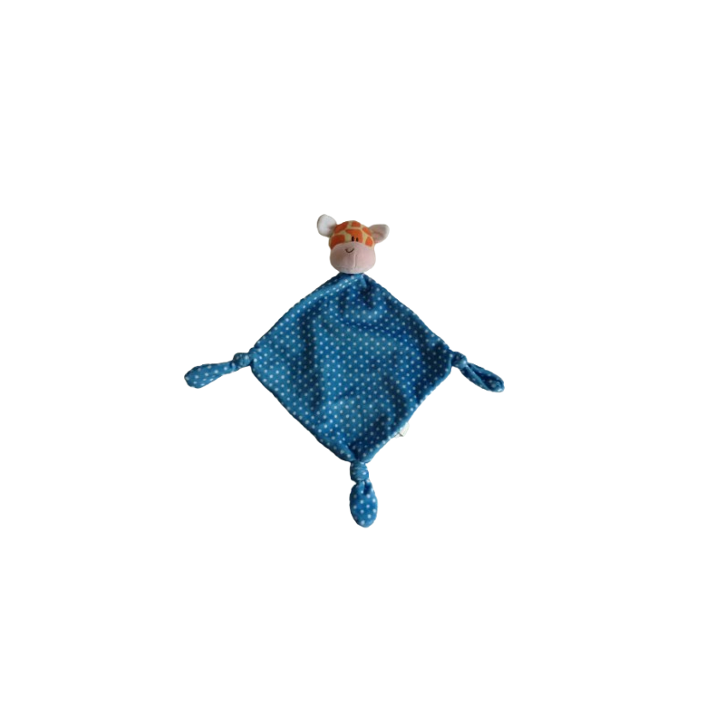 Doudou plat girafe forme losange 37 cm environ, 3 nouages, bleu motif pois blanc. Etat : Comme neuf