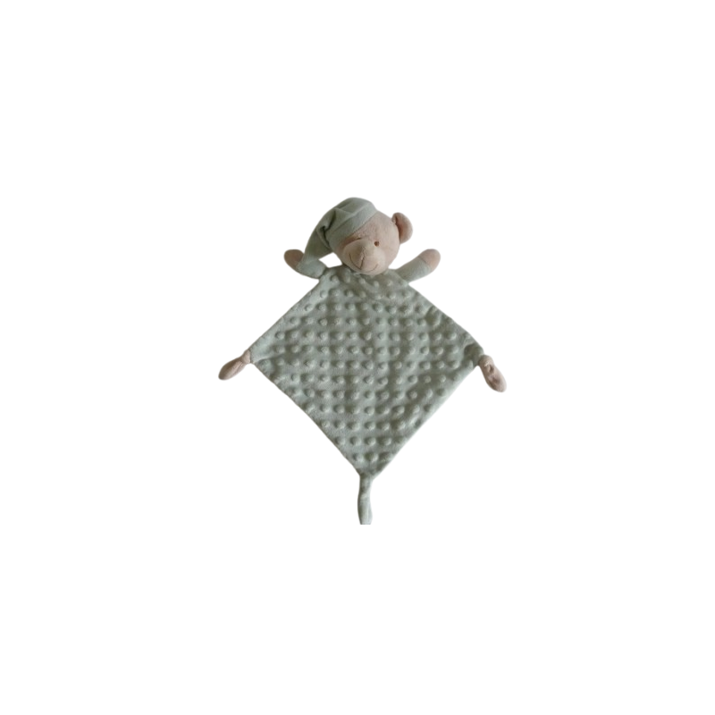 Doudou plat ours forme losange 44 cm environ, beige vert pâle ronds en relief. Etat : Comme neufDestinataire :