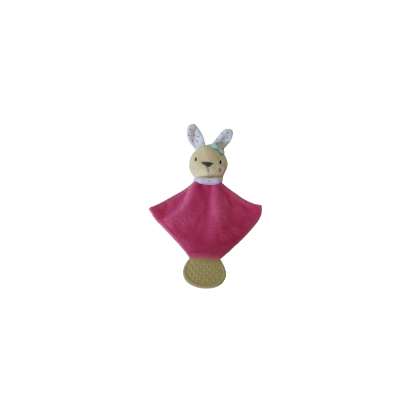 Doudou plat lapin forme losange avec anneau de dentition, 30 cm environ, rose jaune blanc motif étoiles. Etat: Comme neuf (étiquette marque coupée)Destinataire :