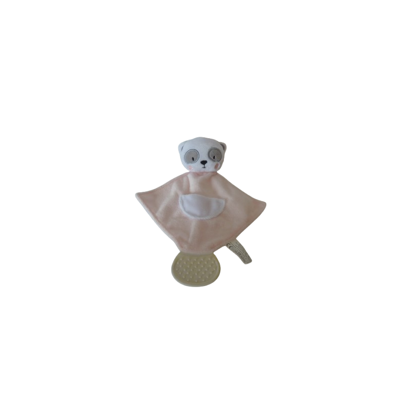 Doudou plat panda forme losange avec anneau de dentition 24 cm environ, petite poche blanche, rose blanc. Etat: Comme neufDestinataire :