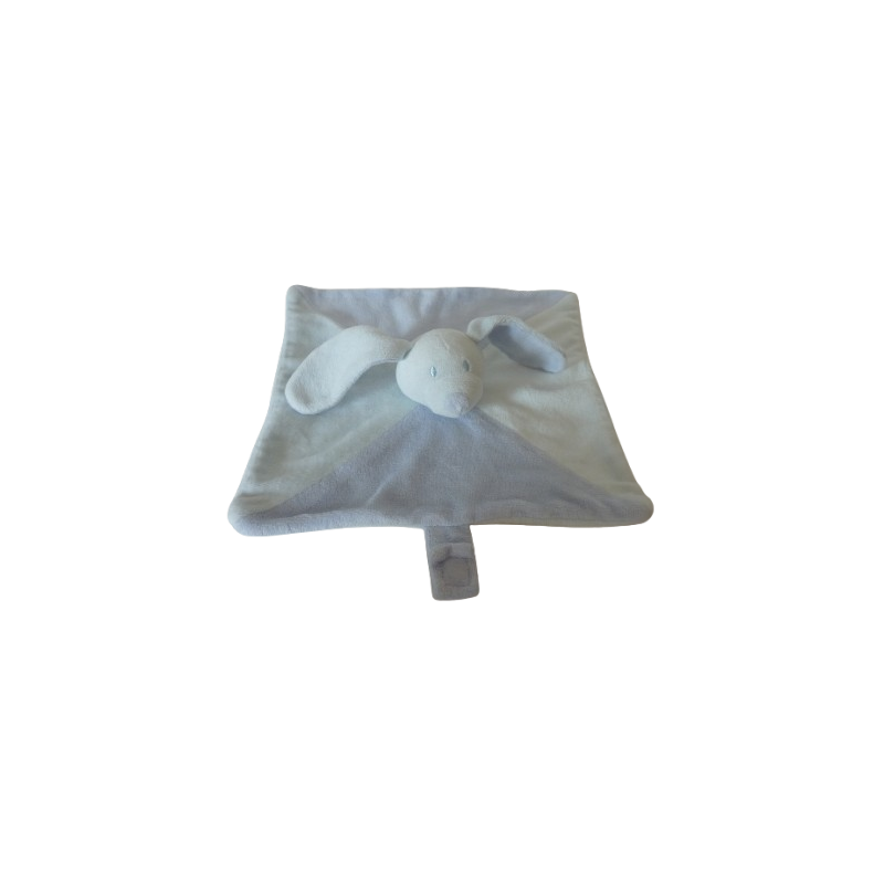Doudou plat lapin 25x25 cm environ bleu turquoise, attache tétine par velcro. Etat : Très bon étatDestinataire :