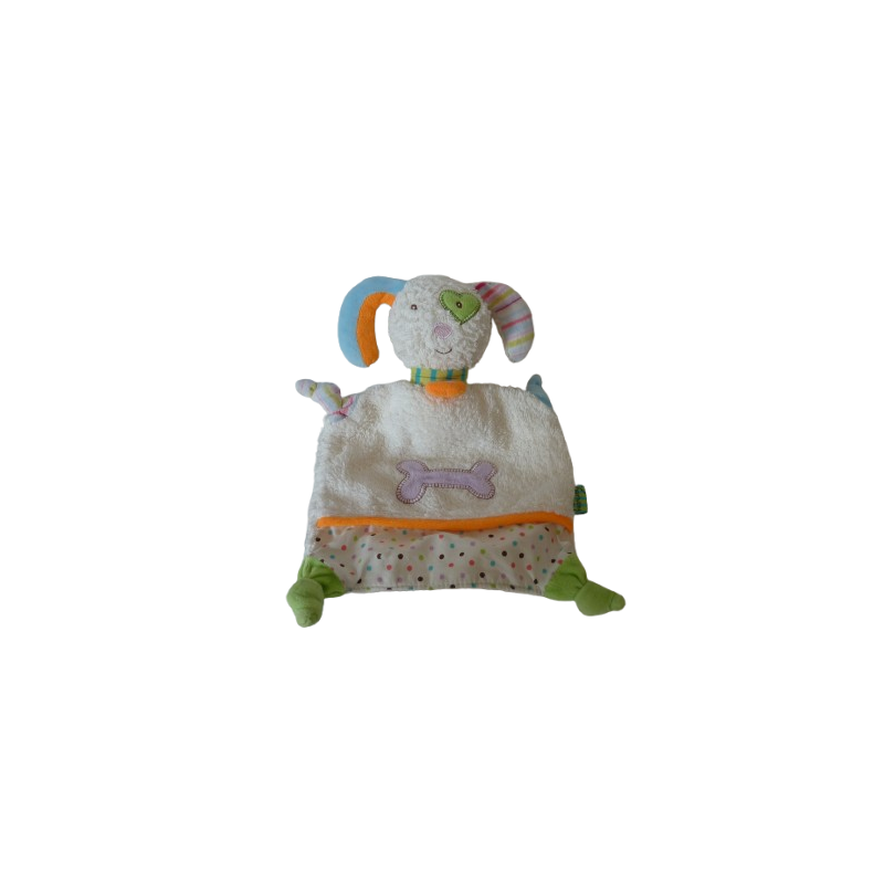 Doudou plat chien 27 cm environ, tissu et matière éponge, blanc multicolore motif os. Etat : Comme neufDestinataire :