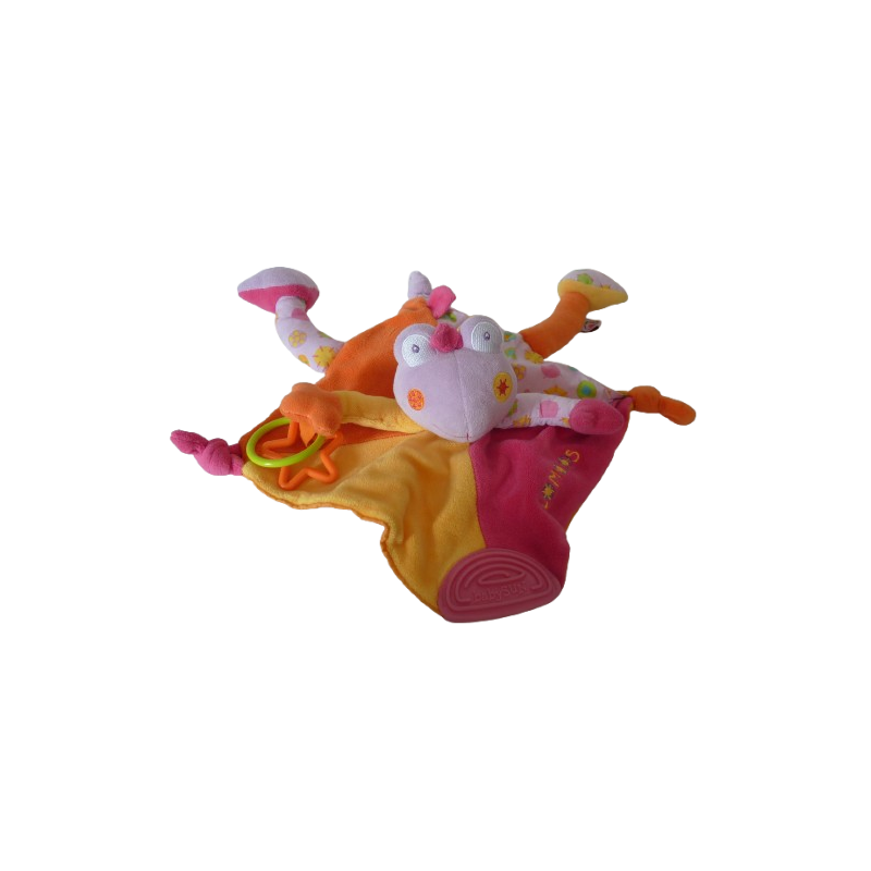 Doudou plat grenouille éveil rose jaune orange mauve motifs, grelot pouet pouet anneau dentition. Etat : Comme neufDestinataire :