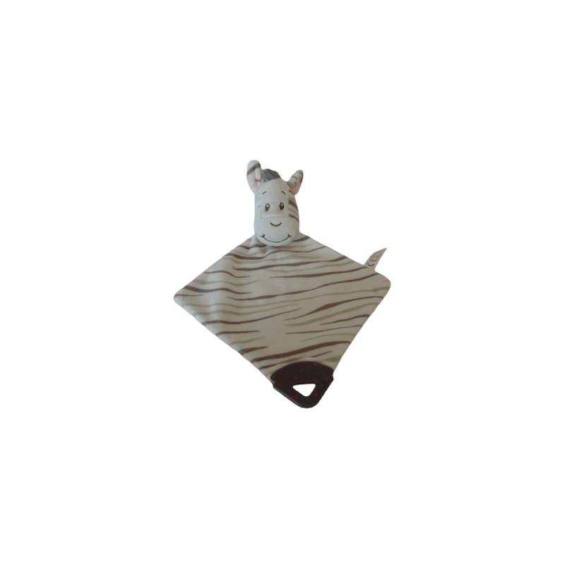 Doudou plat zèbre 31 cm environ, anneau de dentition, grelot, blanc gris. Etat : Comme neufDestinataire :