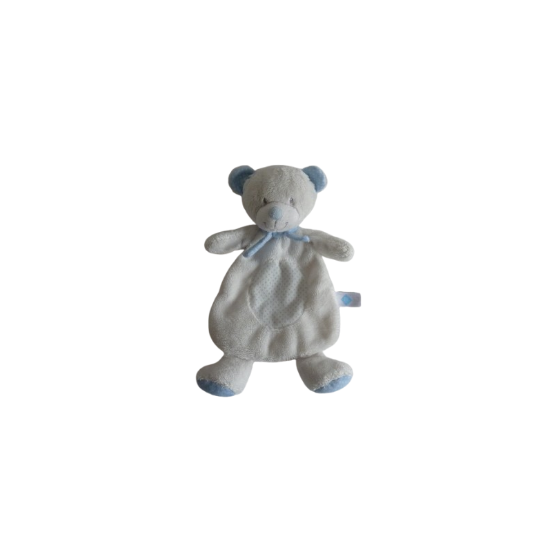 Doudou plat ours 29 cm environ, blanc bleu motif pois, billes dans le doudou. Etat : Le doudou est en très bon état, il est très doux mais tache sur un bras mais rien de méchant, idéal en 2ème doudou.