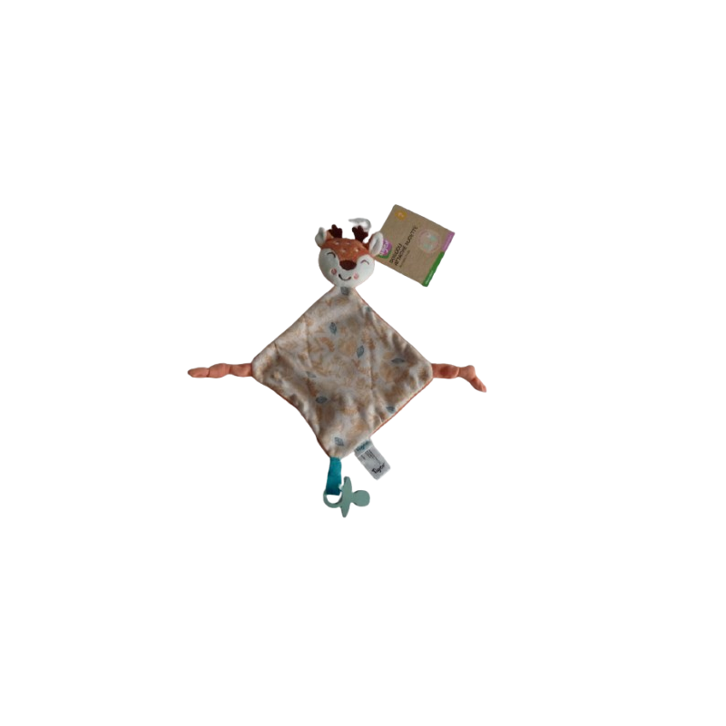 Doudou plat biche ou faon forme losange 30 cm environ, attache tétine, marron blanc motif feuillage. Etat : Neuf