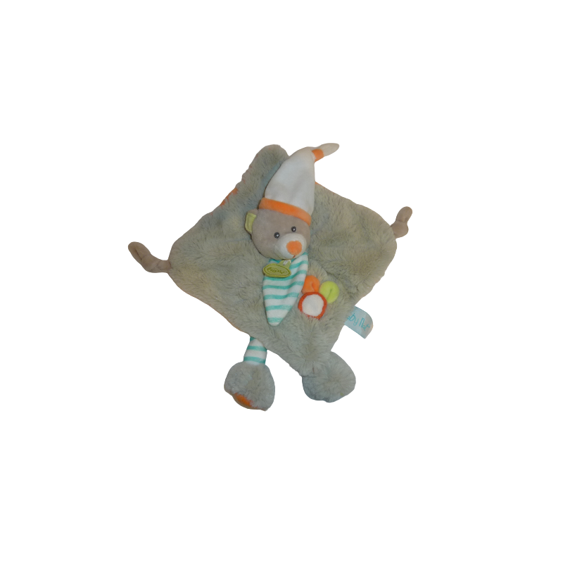 Doudou plat ours 20x20 cm environ, 2 nouages, gris orange. Etat : Neuf sans étiquette boutique. DOUDOU DIFFICILE A TROUVER.